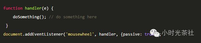 如下面的Html代码中,页面通过调用document.addEventListener来添加一个mousewheel事件的监听器handler,并通过设置passive属性的值为true来声明监听器handler是被动监听mousewheel事件,即handler内部不会调用事件的preventDefault函数。