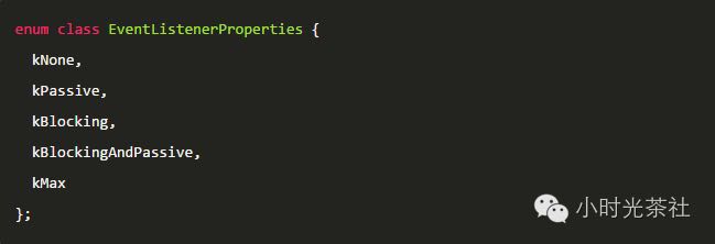 目前Chrome中监听器的类型属性值主要有四种:EventListenerProperties::kNone,EventListenerProperties::kPassive,EventListenerProperties::kBlocking,EventListenerProperties::kBlockingAndPassive,如下代码所述。