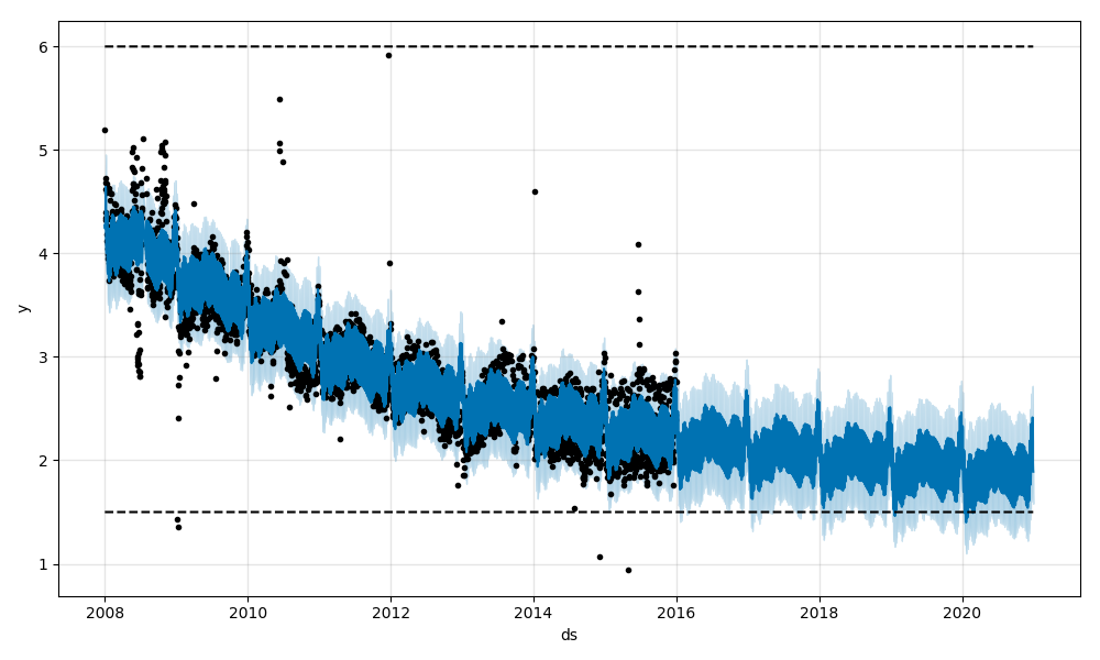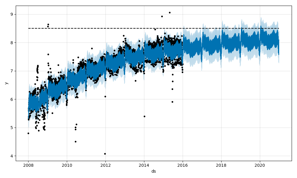 我们像之前的例子一样为预测构造一个dataframe ,但我们还必须指定cap。我们将cap设置上面相同的值,并预测未来3年: