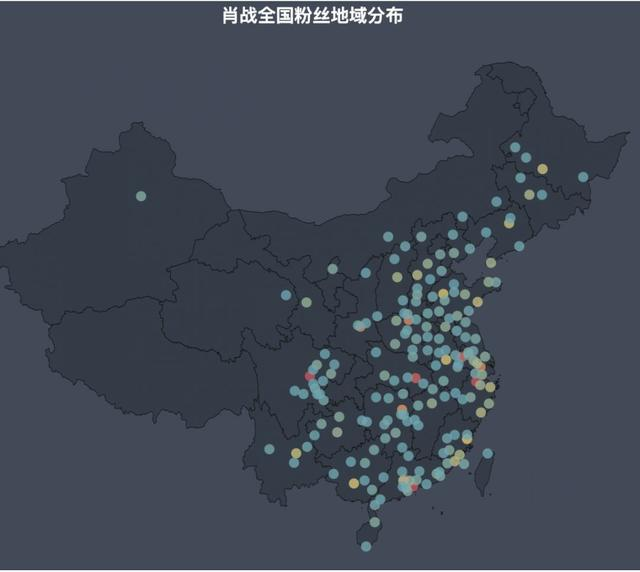 从肖战粉丝的地域分布来看,广东省、江苏、四川以及浙江省这四个省份是其粉丝最为集中的四个省份,小编将粉丝的地域分布投射到完整的地图上,我们可以发现的是中部也有几个省份,比如湖北、湖南两省以及河南,也有不少粉丝喜爱着肖战。