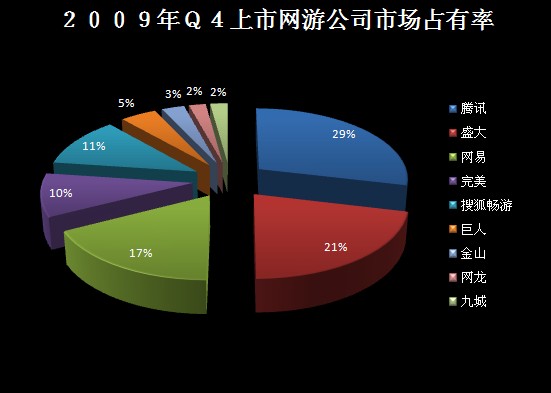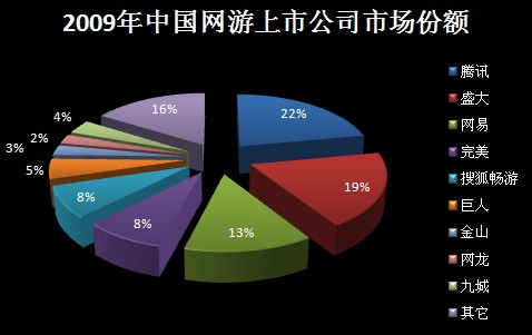 数据显示,2009年中国网游上市公司占据市场份额最大的前四分别是腾讯、盛大、网易、完美,四者皆在2009年利用自身优势保持了稳定发展的态势。