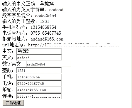 protected void btnVerification_Click(object sender, EventArgs e) { string chinese = txtChinese.Text.Trim(); string english = txtEnglish.Text.Trim(); string numEng = txtNumAndEng.Text.Trim(); string num = txtInteger.Text.Trim(); string mobile = txtMobile.Text.Trim(); string phone = txtPhome.Text.Trim(); string emil = txtMail.Text.Trim(); string url = txtUrl.Text.Trim(); if (Helper.GetInstance().IsChinese(chinese)) { Response.Write("输入的中文正确:" + chinese + "<br/>"); } else { Response.Write("请输入全中文<br/>"); } if (Helper.GetInstance().IsHaveEnglish(english)) { Response.Write("输入的为英文字符串:" + english + "<br/>"); } else { Response.Write("请输入全英文<br/>"); } if (Helper.GetInstance().IsNumAndEng(numEng)) { Response.Write("数字字母混合:" + numEng + "<br/>"); } else { Response.Write("不是正确的数字字母混合<br/>"); } if (Helper.GetInstance().IsUnit(num)) { Response.Write("输入的为正整数:" + num + "<br/>"); } else if (Helper.GetInstance().IsNotNagtive(num)) { Response.Write("输入的为负整数:" + num + "<br/>"); } else { Response.Write("数字输入有误<br/>"); } if (Helper.GetInstance().IsMobile(mobile)) { Response.Write("手机号码为:" + mobile + "<br/>"); } else { Response.Write("手机号码不正确<br/>"); } if (Helper.GetInstance().IsPhone(phone)) { Response.Write("电话号码为:" + phone + "<br/>"); } else { Response.Write("电话号码有误<br/>"); } if (Helper.GetInstance().IsEmail(emil)) { Response.Write("邮箱地址为:" + emil + "<br/>"); } else { Response.Write("邮箱地址有误<br/>"); } if (Helper.GetInstance().IsUrl(url)) { Response.Write("url地址为:" + url + "<br/>"); } else { Response.Write("请输入正确的url地址"); } }