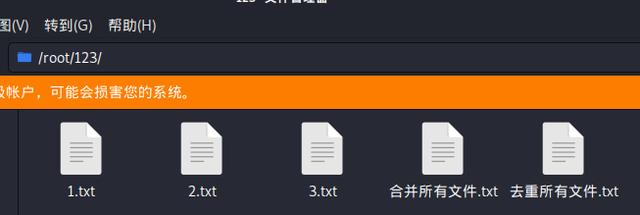 将当前目录下所有文件合并为一个文件:合并所有文件.txt,对该文件进行去重,最终生成去重所有文件.txt,该文件就是最后想要的文件。