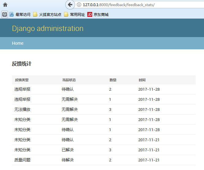 访问http://127.0.0.1:8000/feedback/feedback_stats/ 可以查看到区分反馈类型的问题状态统计信息: