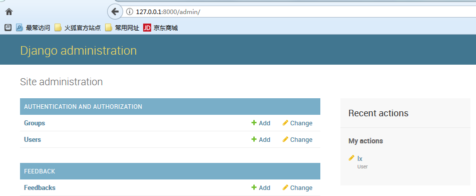 Django admin页面默认的展示是分多个app模块,每个app模块下面定义的数据库model会以表名作为超链接的形式展现出来,比如一个只有Django服务初始化时默认只有一个Auth模块,其下有Users与Groups两张表,添加用户自定义的Feedback模块及Feedback表的model之后,admin site页面会如下所示: