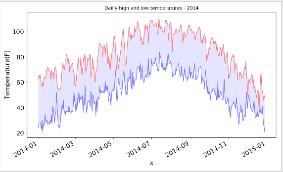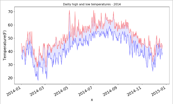 # 我们向fill_between() 传递了一个 x 值系列:列表dates ,还传递了两个 y 值系列:highs 和lows 。