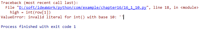 该traceback指出,Python无法处理其中一天的最高气温,因为它无法将空字符串(' ' )转换为整数。只要看一下death_valley_2014.csv,就能发现其中的问题