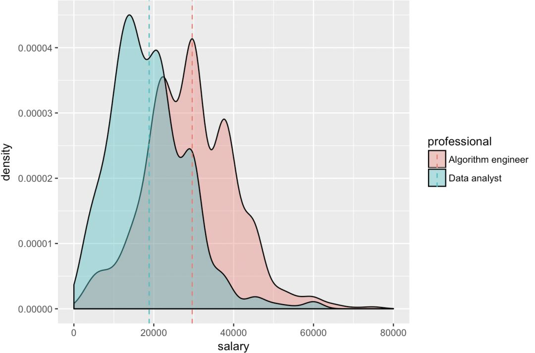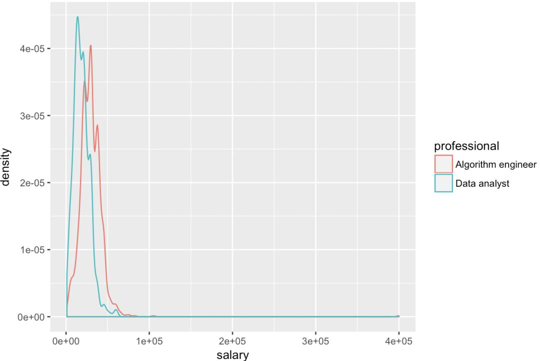 此时虽然整出来密度曲线,但是并没有根据两个岗位进行区分,因此我们使用下面代码区分开两个岗位,注意里面函数里面color就是指定岗位