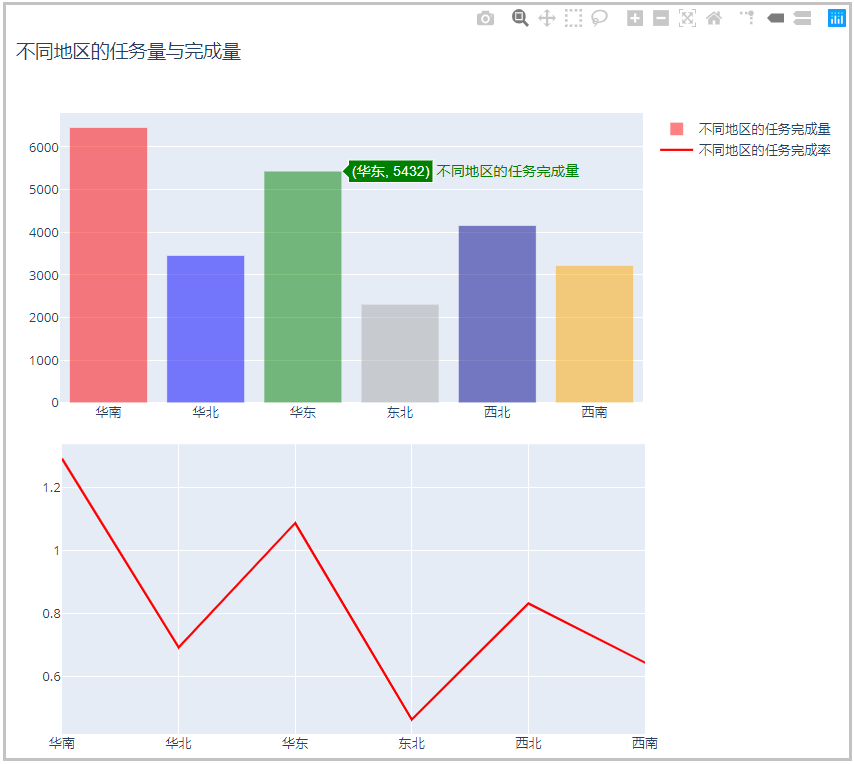 2)绘制不同地区的“任务完成量”和“任务完成率”情况