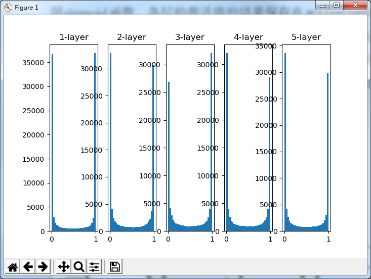 由图可知,各层的激活值呈现偏向0和1的分布。这里使用的sigmoid函数是S型函数。