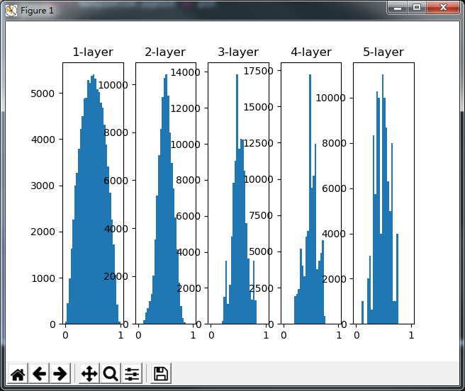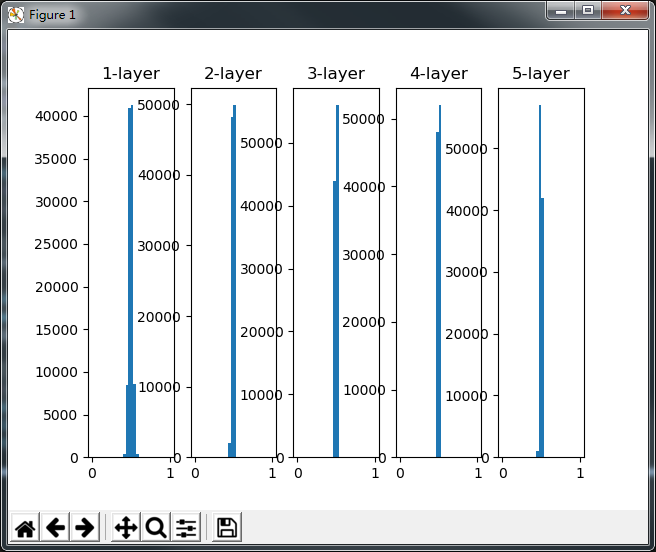 这次呈集中在0.5附近的分布。因为不像刚那样偏向0和1,因此不会发生梯度消失的问题。但是激活值仍有偏向,说明在表现力上会有问题。如果有多个神经元都输出几乎相同结果,那它们的意义就不大了,理论上也可以由一个神经元来表达这个基本相同的事情。因此激活值在分布上有所偏向会出现“表现力受限”的问题。