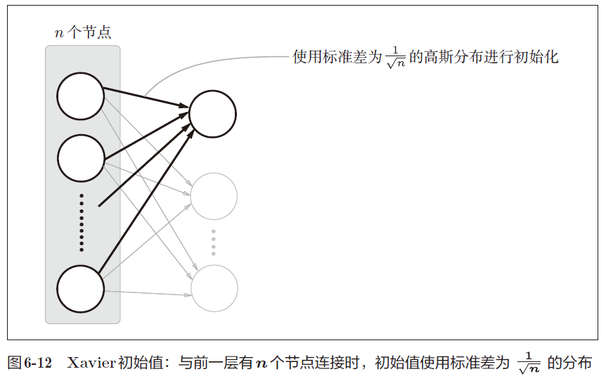 Xavier的论文中,为了使各层的激活值呈现出具有相同广度的分布,推导了合适的权重尺度。推导出的结论是,如果前一层的节点数为n,则初始值使用标准差为的高斯分布。