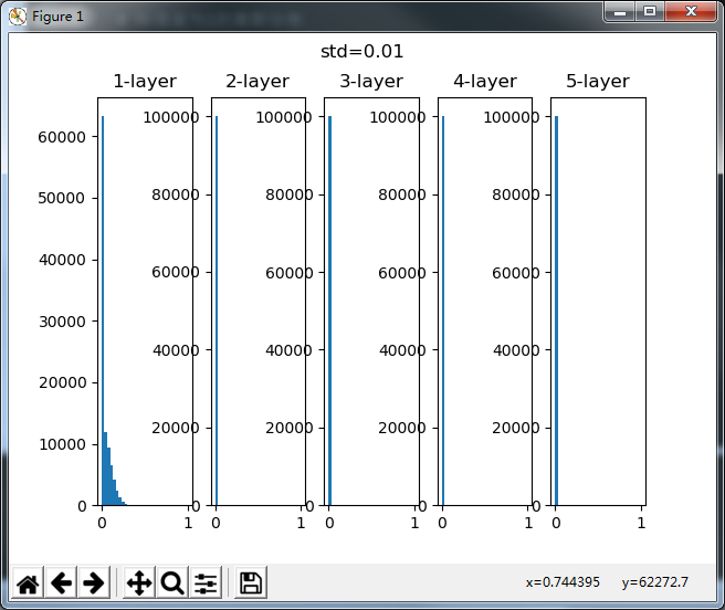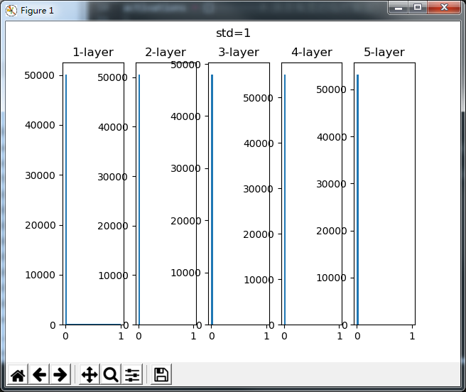 前两张图可以看到各层激活值非常小(标准差为1的几乎没有激活值)。神经网络上传递的值也非常小,说明逆向传播时的梯度也非常小。这会导致学习几乎没有进展。