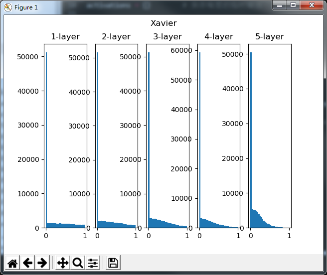 然后是Xavier初始值的结果,这种情况下,随着层的加深,偏向一点点变大。实际上,层加深后,激活值的偏向变大,学习时会出现梯度消失的问题。