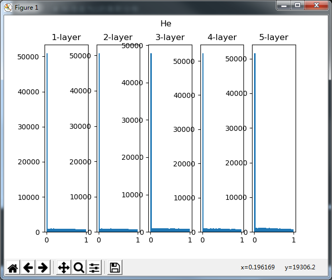 当使用ReLU作为激活函数时,看看四个实验(1.标准差为1的高斯分布,2.标准差为0.01的高斯分布,3.Xavier初始值,4.He初始值)的分布效果。