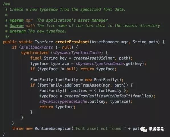 它依赖 sDynamicTypefaceCache 来保证线程的安全。并且会使用 createAssetUid() 来获取到这个字体的唯一 key ,通过这个唯一 key ,从 sDynamicTypefaceCache 中获取已经被加载过的字体,如果没有的话,再创建一个 FontFamily 的对象,通过 FontFamily.addFontFromAsset() 方法,将这个字体文件加入进去,最后通过 createFromFamiliesWithDefault() 中,直接创建一个字体,最终存放到 sDynamicTypefaceCache 中去做一道缓存。