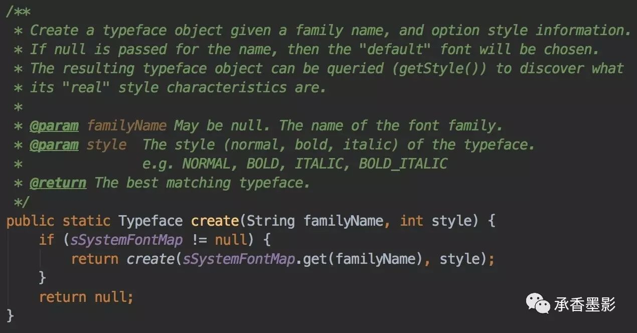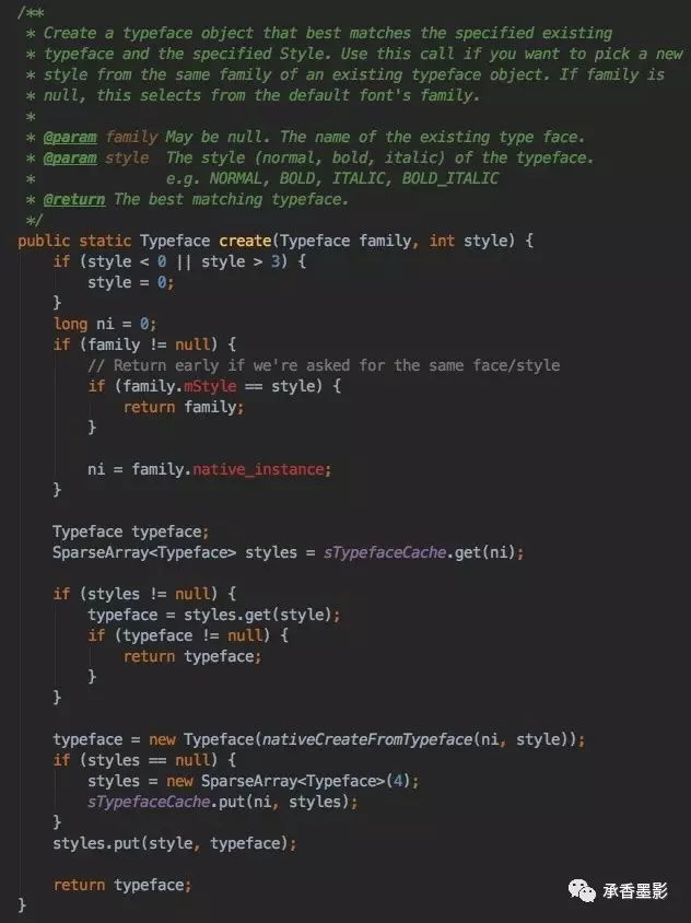到这里,该讲到前面提到的 create() 方法了,这里需要传递进来一个 Typeface 对象,并通过设置 style,为这个原始的 Typeface 字体类附加新的效果。