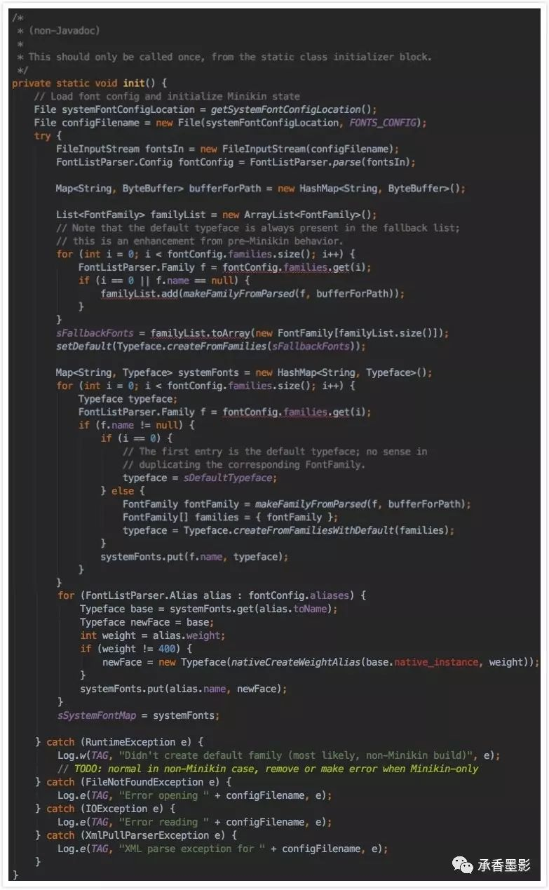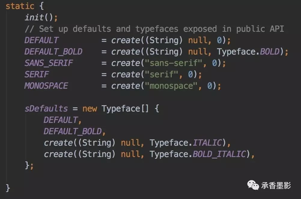 这里会先调用 init() 方法,加载系统自带的字体,然后再初始化一系列,例如 DEFAULT 、SNAS_SERIF 等自带字体。