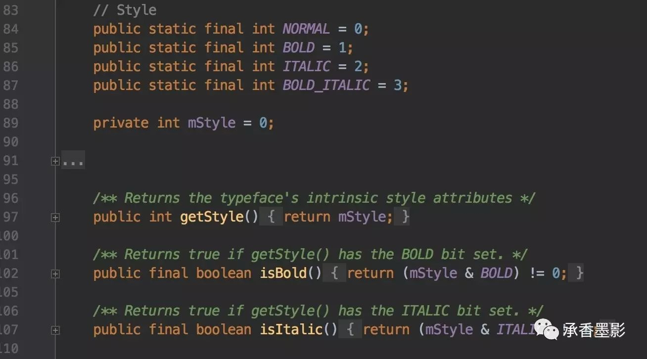 可以看到,它除了需要传递一个 familyName 之外,还需要传递一个 style ,这里的 style ,就是之前说的 android:textStyle 传递的值,用于设定字体的粗体(bold)、斜体(italic)等参数的。