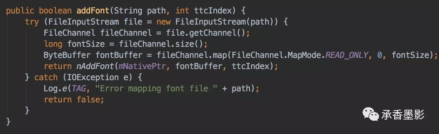 拿 addFont() 方法举例,它会先获取 FileInputStream 对象,转换成一个 ByteBuffer 然后传递给 native 方法 nAddFont() 来加载字体。