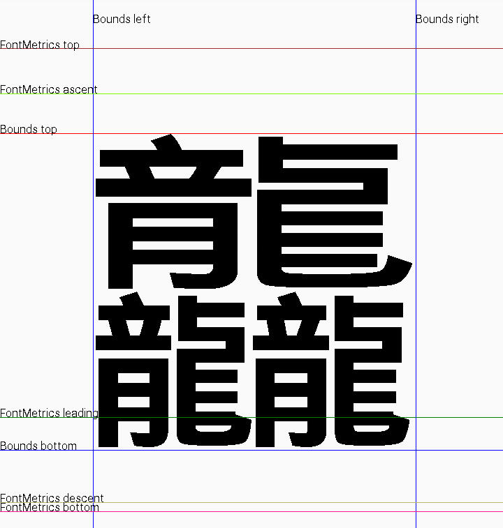首先getFontMetrics()我们可以获得文字的实际占用位置的各个高度基线(以500xp的文字为例),各个属性不解释,直接看图就能看出来。