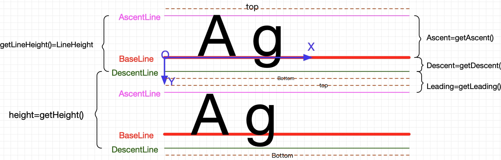 Paint.FontMetrics(Int)类,定义了字符的ascent、top、descent和bottom。