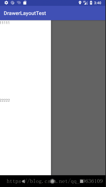 <?xml version="1.0" encoding="utf-8"?> <android.support.v4.widget.DrawerLayout android:id="@+id/drawerlayout_main" xmlns:android="http://schemas.android.com/apk/res/android" xmlns:tools="http://schemas.android.com/tools" xmlns:app="http://schemas.android.com/apk/res-auto" android:layout_width="match_parent" android:layout_height="match_parent" tools:context=".MainActivity" > <LinearLayout android:layout_width="200dp" android:layout_height="match_parent" android:layout_gravity="start" android:orientation="vertical" android:background="#ffff"> <TextView android:id="@+id/item_textview_main_1" android:layout_width="match_parent" android:layout_height="0dp" android:layout_weight="1" android:text="11111" /> <TextView android:id="@+id/item_textview_main_2" android:layout_width="match_parent" android:layout_height="0dp" android:layout_weight="1" android:text="22222" /> </LinearLayout> <LinearLayout android:layout_width="match_parent" android:layout_height="match_parent"> <TextView android:id="@+id/home_textview_main" android:layout_width="match_parent" android:layout_height="match_parent" android:text="11111111111111111" /> </LinearLayout> </android.support.v4.widget.DrawerLayout>