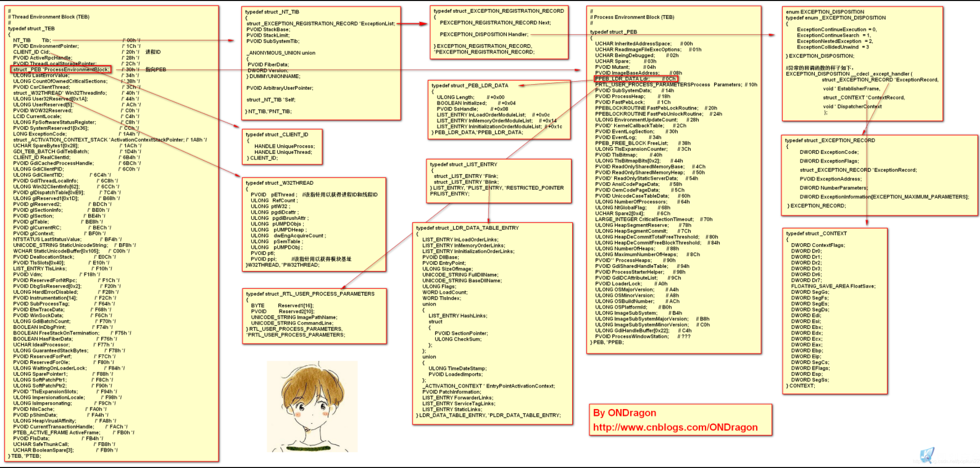 1.Windows通过TEB封装信息,TEB中包含PEB表,如图: