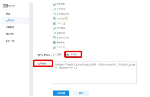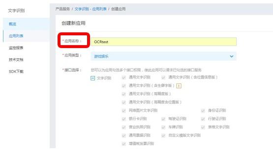 A 输入应用名 ------B 文字识别包名:不需要(本教程只针对API调用,不涉及移动端SDK所以选择“不需要”)