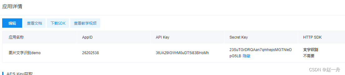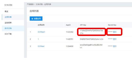 点击“返回创建应用列表”后,页面出现平台分配的密钥:API Key、Secret Key(即AK、SK)。