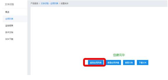 创建后,点击“返回应用列表”