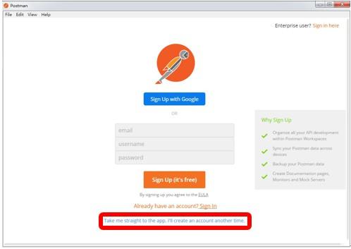 (2) 初次登录无账号,可点击图示最下方蓝色字体部分,直接进入postman主界面。