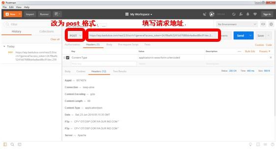 (1) 将请求格式切换为“post” 找到"access_token":"24.cd5db5c31dc74eaa870a38d3977f8fbf.2592000.1654821673.282335-26202538"