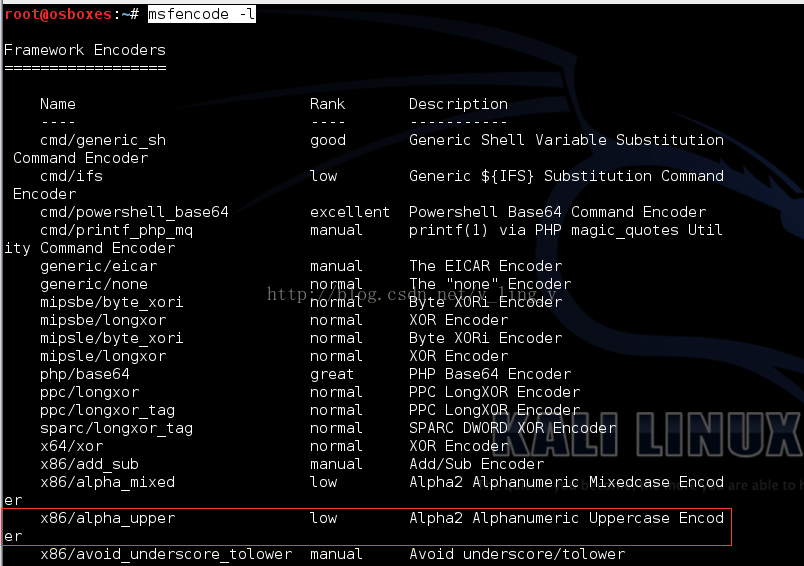 Msfencode –l可以查看所有的编码器。