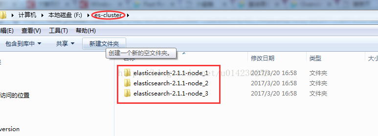 1、创建一个文件夹“es-cluster”,然后解压zip包后,进入文件夹中将里面的一个单独文件夹复制多份到“es-cluster”文件夹中。然后重命名为elasticsearch-2.1.1-node_1,elasticsearch-2.1.1-node_2,elasticsearch-2.1.1-node_3,。。。如下图所示