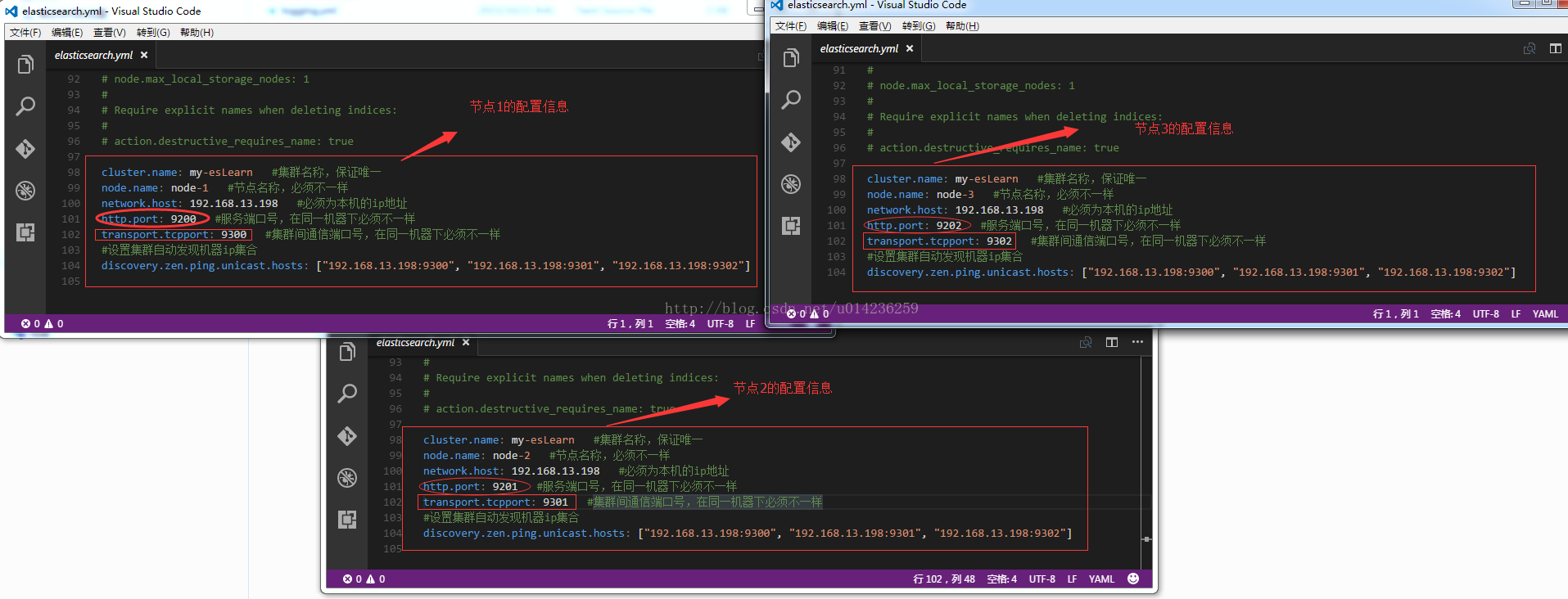discovery.zen.ping.unicast.hosts: ["192.168.13.198:9300", "192.168.13.198:9301", "192.168.13.198:9302"]