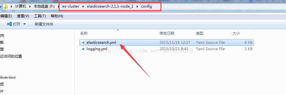 2、修改配置文件:进入到其中某个节点文件中config文件夹中,打开elasticsearch.yml进行配置