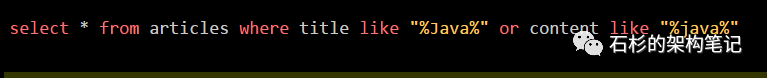 那么这个时候,比如我们要是用数据库来进行搜索包含“Java”这个关键字的所有帖子,大致SQL如下: