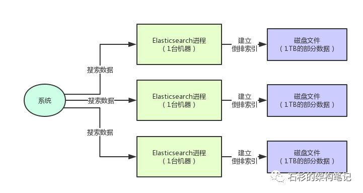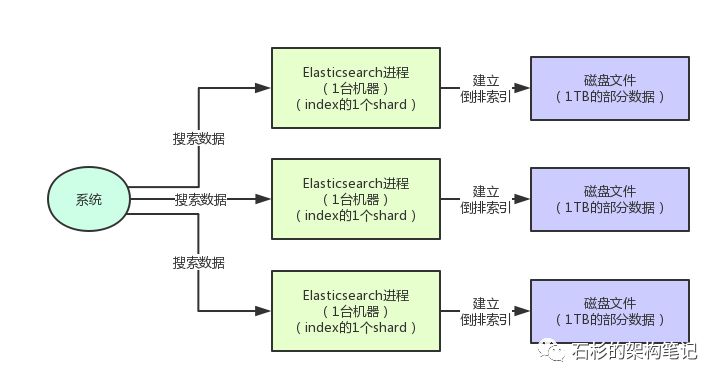 现在你总共有3TB的数据,那么你搞3台机器,每台机器上部署一个ES进程,管理那台机器上的1TB数据就可以了。