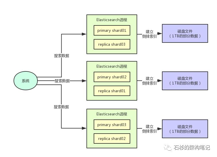 而且,你在搜索数据的时候,不就可以利用3台机器来对分布式存储后的数据进行搜索了?每台机器上的ES进程不都可以对一部分数据搜索?这不就是分布式的搜索?