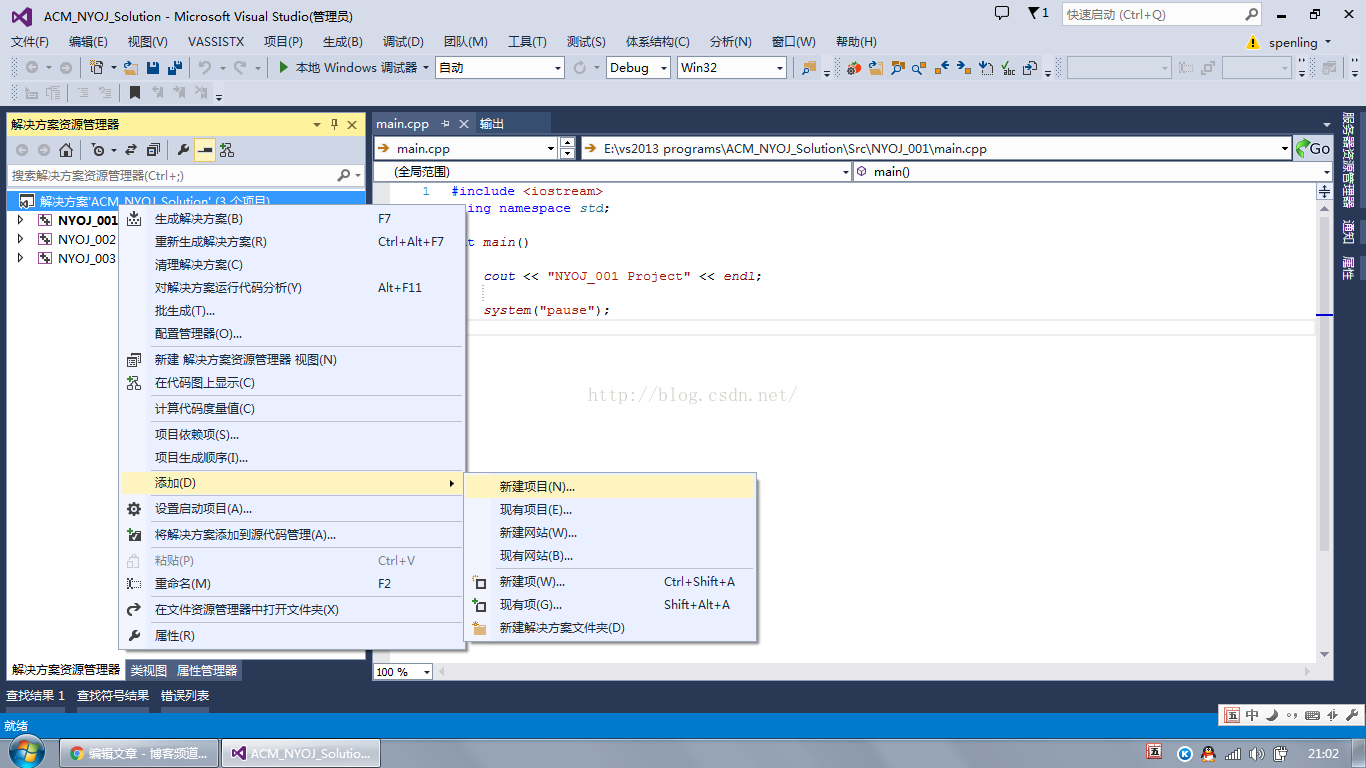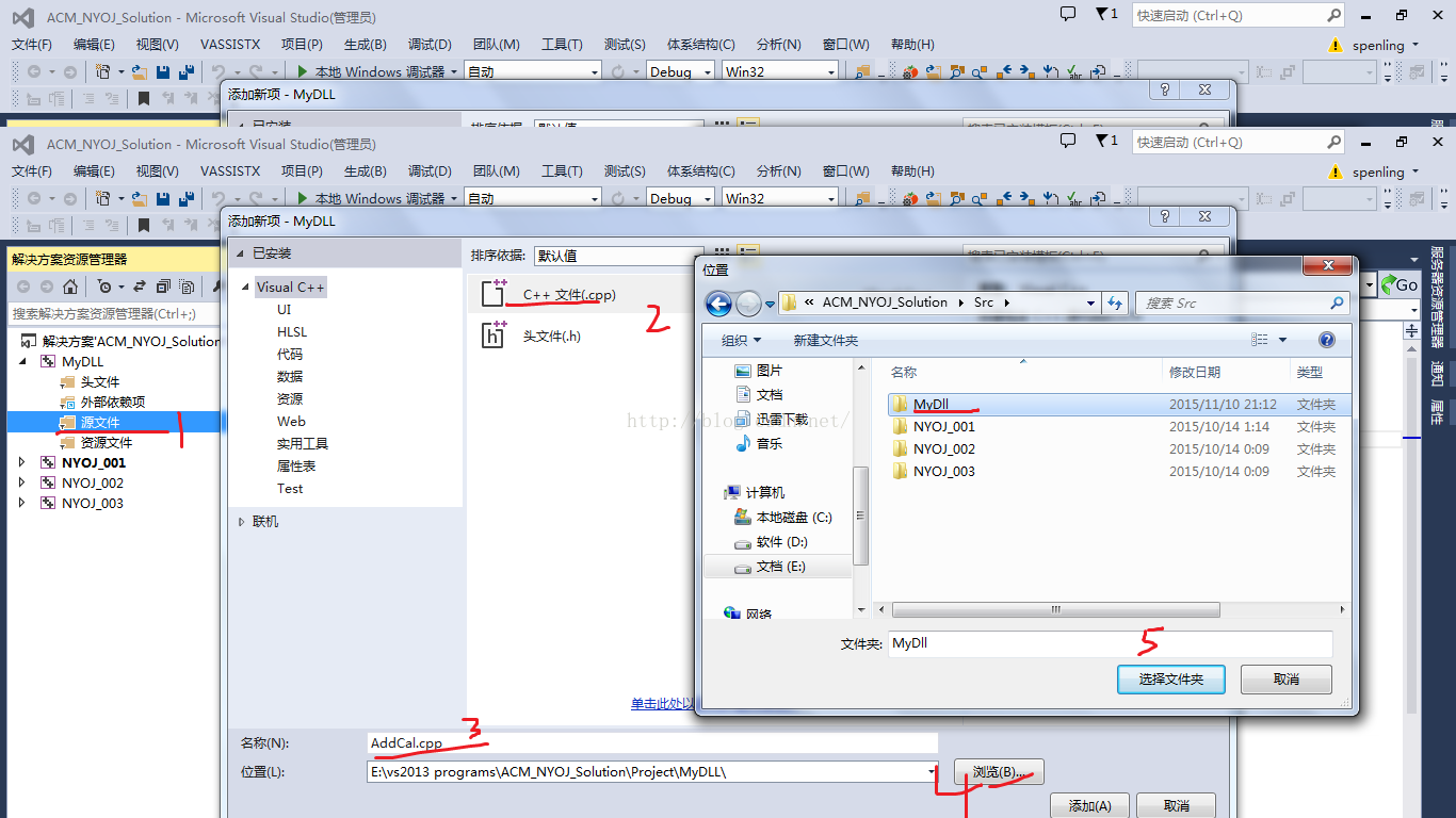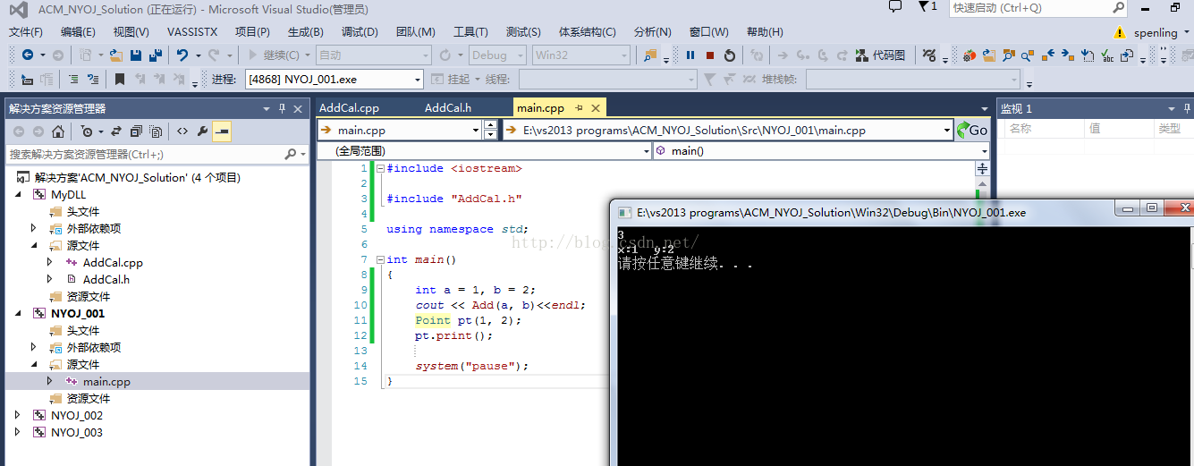 我们在NYOJ_001项目中引用刚才MyDll中生成的Dll,首先首先将上面生成的dll拷贝到项目NYOJ_OO1的.exe生成的目录下。然后设置项目属性,