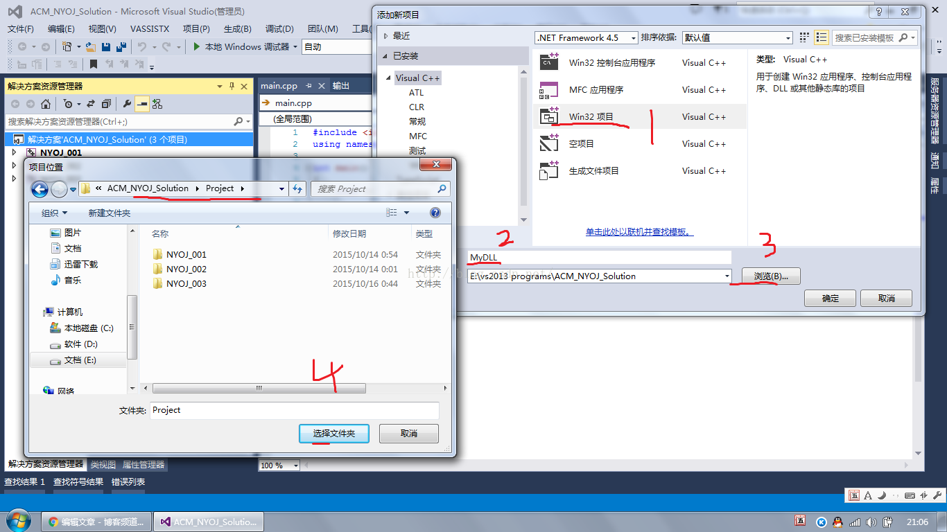 选择Win32项目,项目命名为MyDLL,单击浏览按键,选择Project文件夹,这是我们之前自己建的一个文件夹,专门用来存放各个项目的项目相关文件。