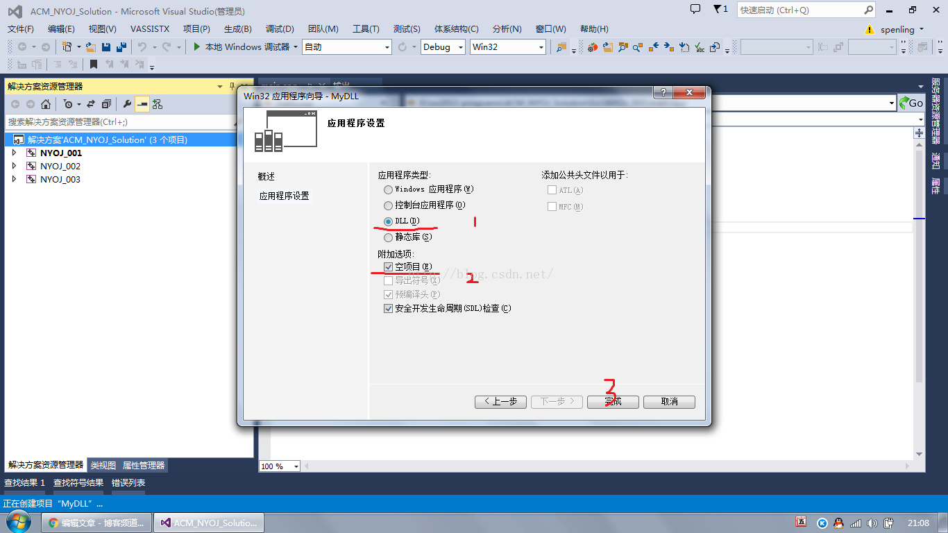 单击下一步,选择"DLL"和"空项目"两个选项,完成。