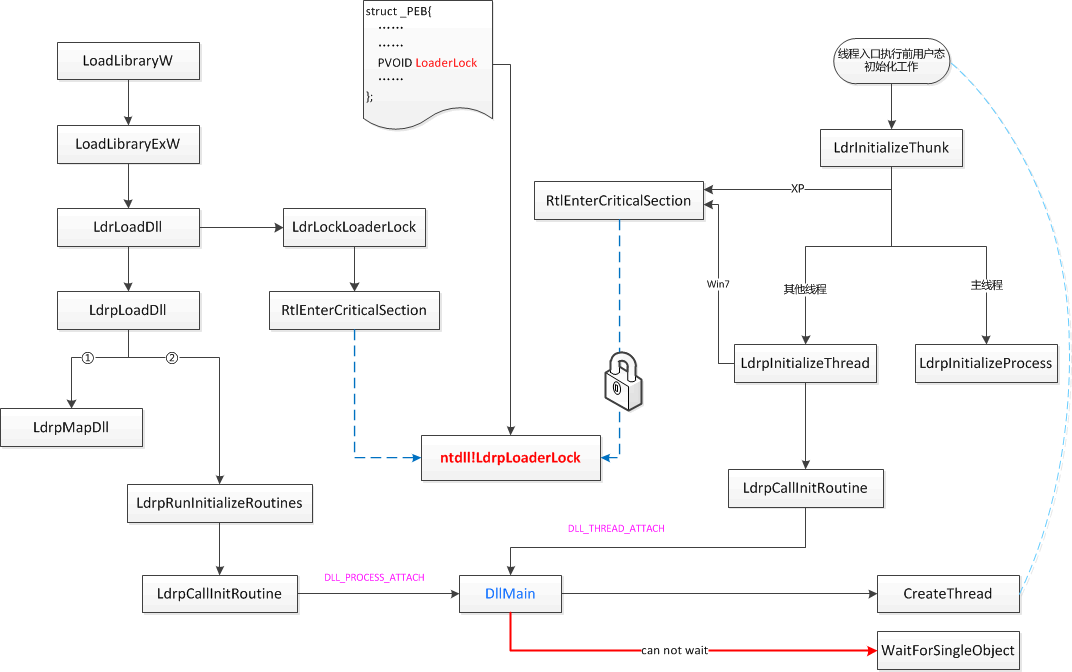 以上就是悲凉墨镜最近收集整理的关于一张图系列——为什么在DllMain里面创建了线程并Wait会卡死的全部内容,更多相关一张图系列——为什么在DllMain里面创建了线程并Wait会卡死内容请搜索靠谱客的其他文章。
