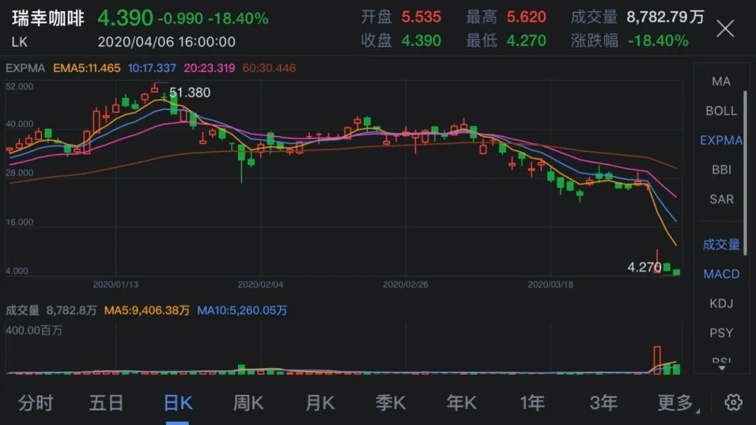 消息一出,瑞幸股价再度崩盘,盘中以4.27美元再刷新低,收盘时跌幅达18.40%。
