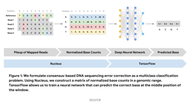 Colab Notebook 提供了一个关于如何使用细胞核和张力流进行“DNA测序错误纠正”的不错介绍。这里有一篇关于深度学习架构在探索DNA中的应用的详细文章。