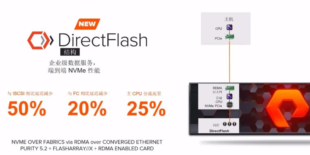 虽然Pure Storage不是定义NVMe标准的企业,但是一直致力于推动NVMe的界面规范成为全闪存存储设备的标准。如今这一梦想正加速照进现实。Pure Storage推出了最新的专为NVMe和NVMe-oF设计的DirectFlash模块和软件。DirectFlash架构将性能密度提升4倍,带宽提升4倍,容量密度提升2倍。Pure Storage大中华区系统工程经理何与晖介绍说,DirectFlash提供了企业级数据服务,以及端到端的NVMe性能,比光纤通道连接的延迟降低20%。