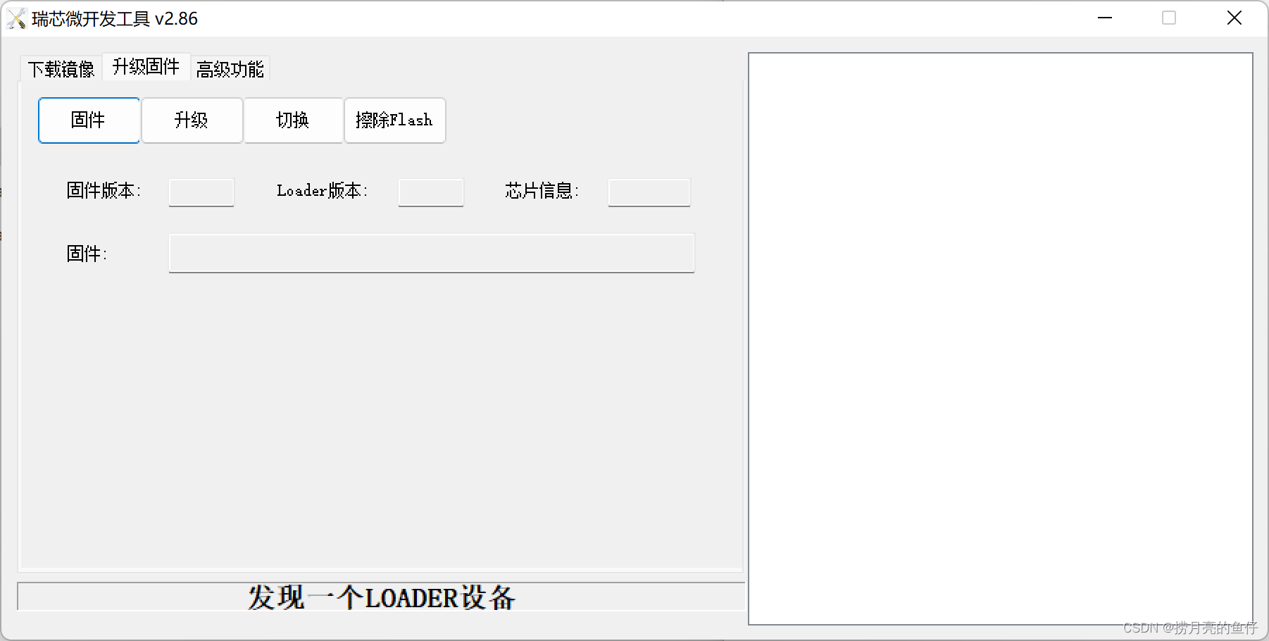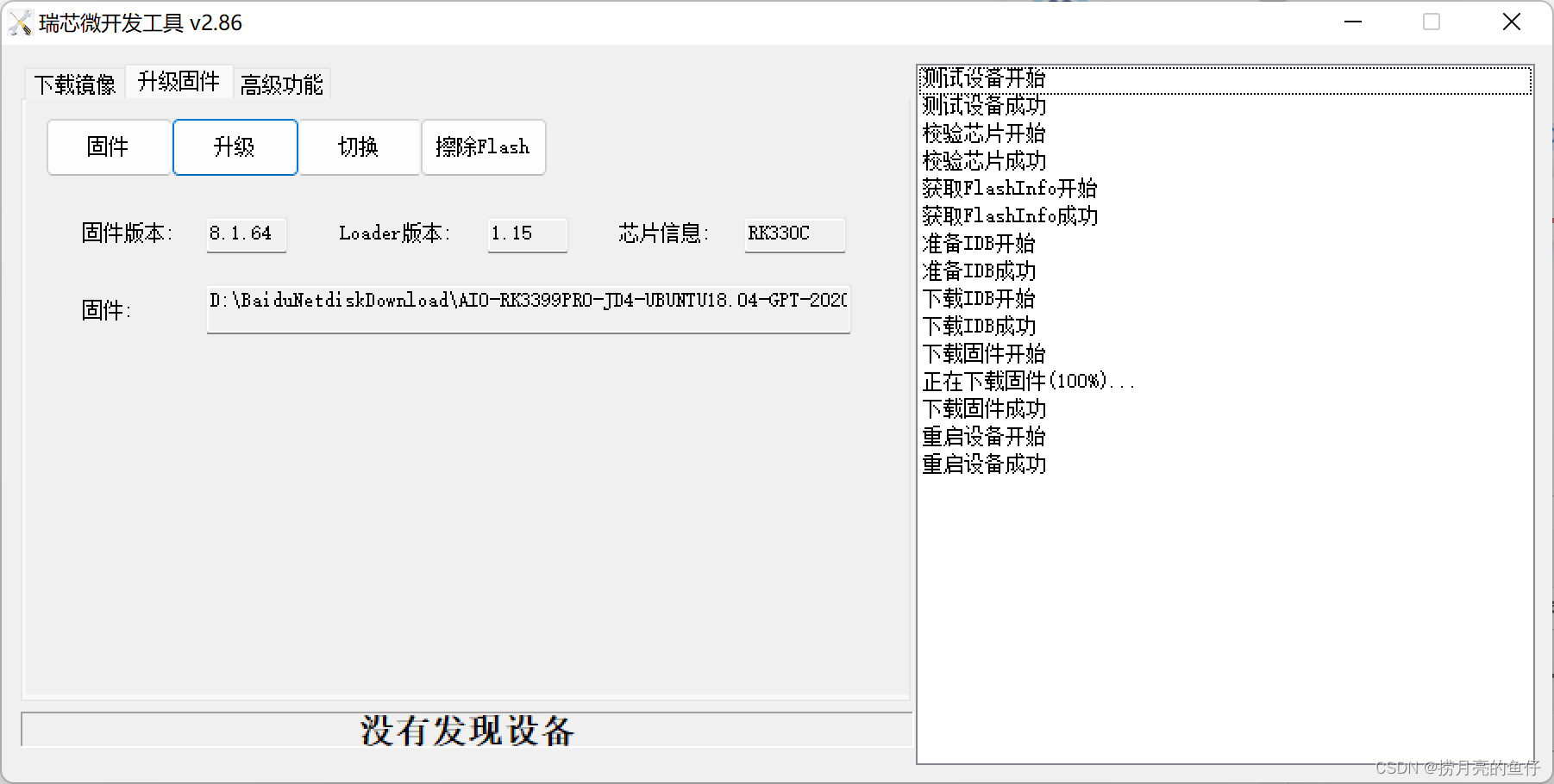点升级就开始刷机了,如下,刷完机子右边的信息栏就有下载固件成功、重启设备开始、重启设备完成等字,并且连接3399的显示器会亮起来,下面又变回“没有发现设备”。这时候那根连接主机的双usb可以断开了。
